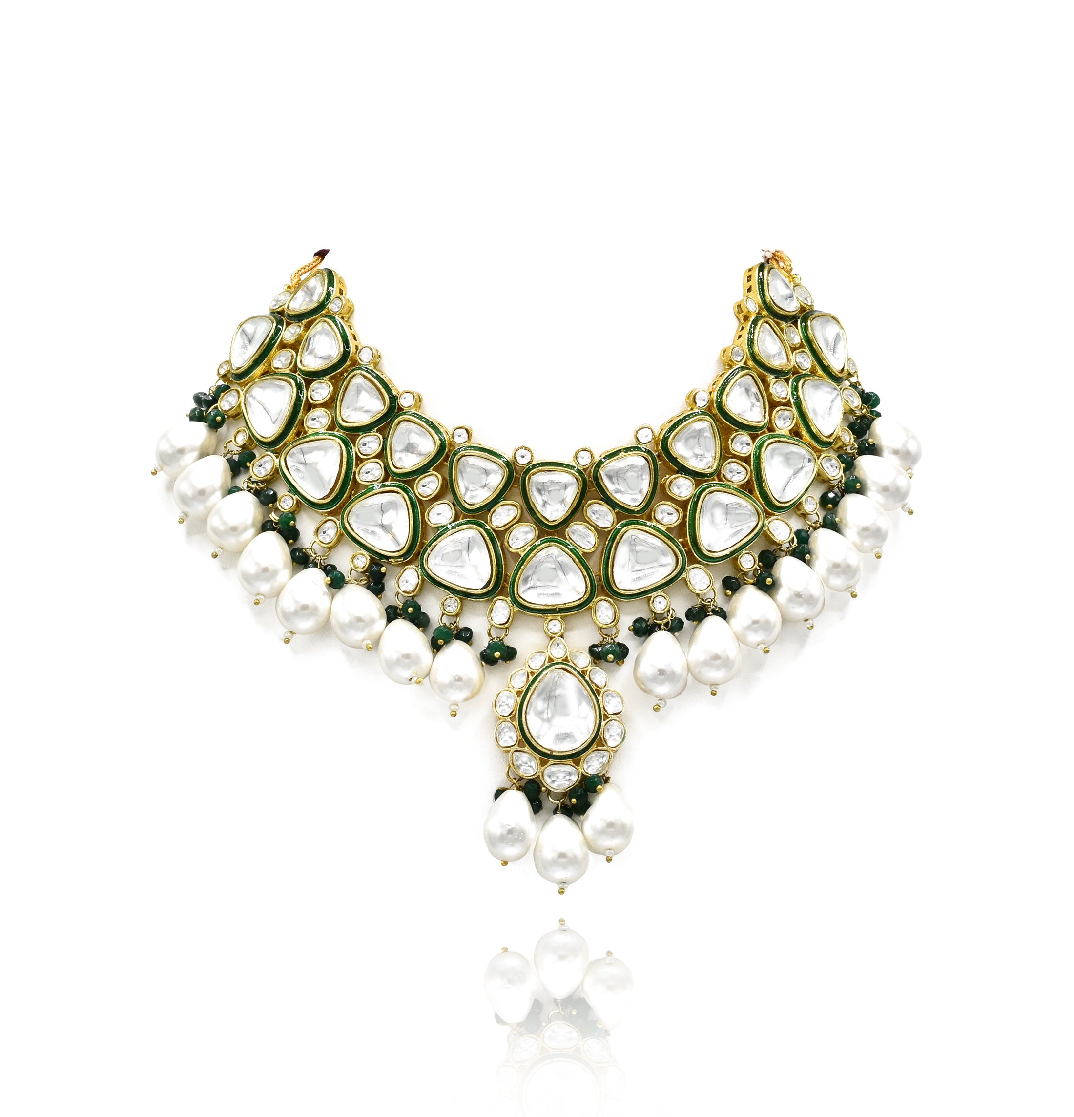 This modern piece inspired by the rich heritage has a whimsical charm. A traditional yet glamorous necklace of uncut kundan where each piece is hand enameled in green to perfection.This beautiful piece is embellished with hanging baroque pearls at the bottom.