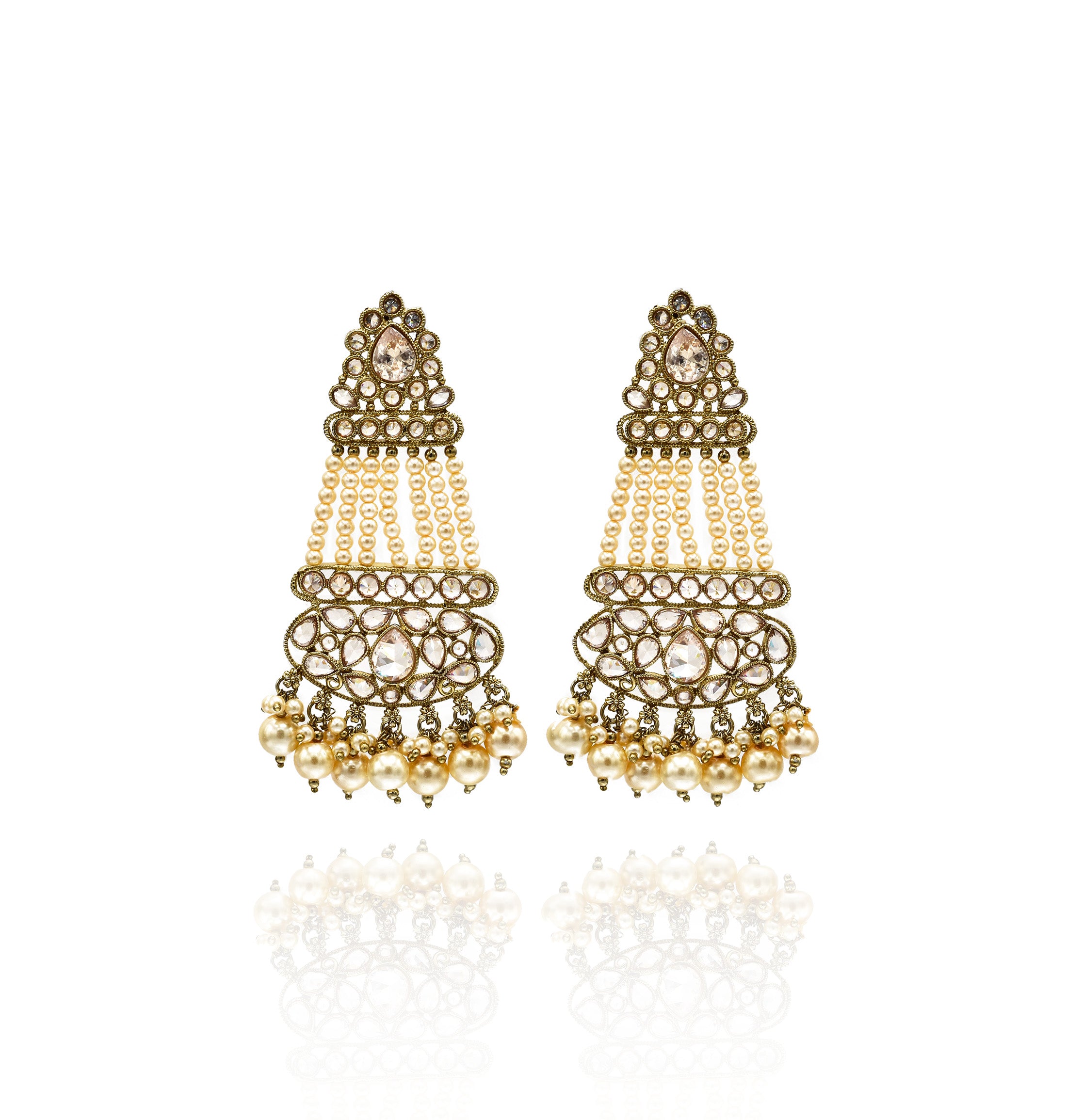 A mesmerizing pair embellished with Pearls, multicolored jarkan stones and gold polished.