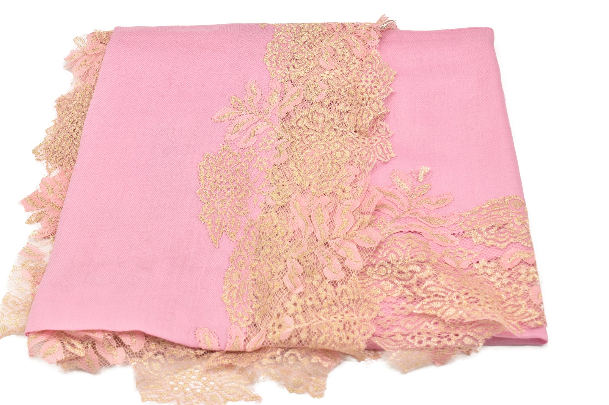 A ravishing pashmina shawl embellished with French Lace on all sides of the border. A subtle shimmer to the lace add the glamour and style. A high quality French lace is used which is very soft to touch and doesn't irritate the skin.